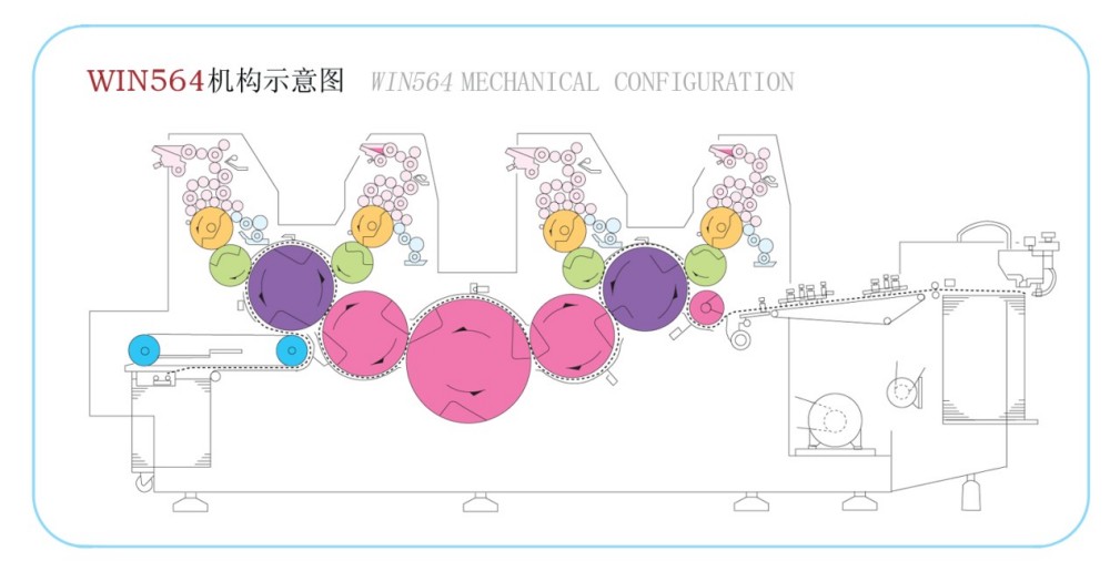 Подвійний діаметр печатного циліндра і потрійний доступний циліндр передачі діаметра, скорочення часу з'єднання паперу, удосконалення точність реєстрації Пластинчастий циліндр і ковдровий циліндр проходять наскрізь носій, що працює стабільно, забезпечуючи якісний друк зображення.