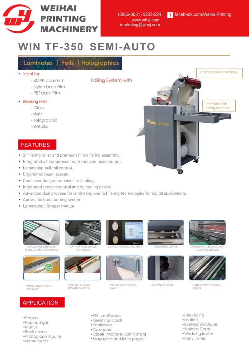 WIN надає професійну машину для ламінування та фольгування (TF350/ATF380), також звану машиною для ламінування та фольгування без виготовлення форм, яка бездоганно підключається до цифрової преси та листової цифрової струминної преси. Це високоефективне післядрукарське обладнання поєднує в собі функції ламінування, гарячого тиснення та холодного фольгування. За один прохід можна наносити глянцеві, матові та лазерні плівки, а також точне тиснення металевою фольгою. Завдяки точному контролю температури та тиску ця машина для ламінування та фольгування забезпечує ефект штампування без бульбашок, без деформації та стійкий. Він підтримує автоматичну подачу паперу, стабільне транспортування та високу точність реєстрації, що значно покращує зовнішній вигляд і додаткову вартість друкованої продукції. Цей довговічний і простий в експлуатації апарат для ламінування та фольгування широко використовується для високоякісних візитних карток, подарункових коробок, сертифікатів, обкладинок книг і високоякісних рекламних матеріалів.