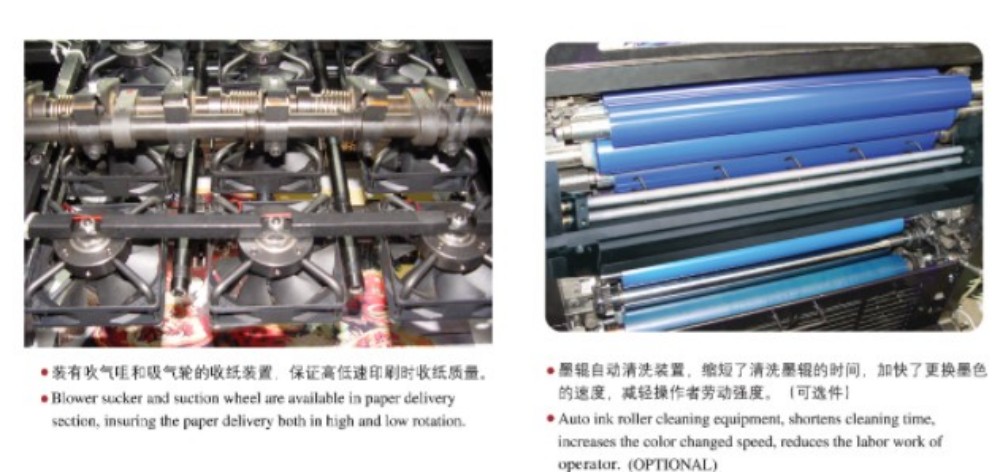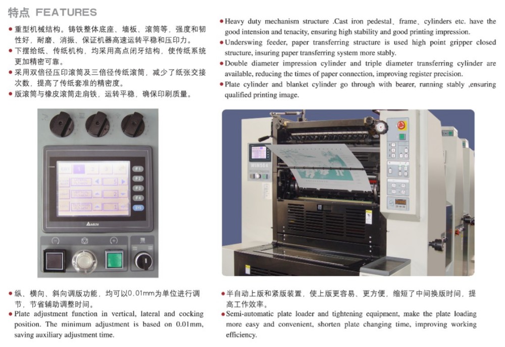 Офсетний друкарський верстат формату A3 для чотириколірного друку етикеток розроблено з високопродуктивними модулями, і всі вони мають найвищу якість — високоточні ролики та шестерні, міцний механізм подавання паперу, високоточна система реєстрації паперу та стабільна система подачі чорнила. Його створено відповідно до вимог ринку щодо високоякісного, ефективного та доступного кольорового друку окремих аркушів. Вам також не потрібно дотримуватися лише однієї товщини паперу — він працює як з тонким папером (0,04 мм), так і з товстим картоном (0,4 мм). Також є сенсорний екран керування з інтуїтивно зрозумілим інтерфейсом програмування, що дозволяє регулювати налаштування та параметри друку розумним і простим способом.