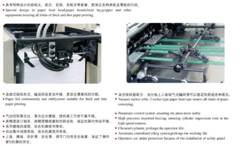 Офсетний друкарський верстат формату A3 для чотириколірного друку упаковки розроблено з високопродуктивними модулями, і всі вони мають найвищу якість — високоточні ролики та шестерні, міцний механізм подачі паперу, високоточна система реєстрації паперу та стабільна система подачі чорнила. Його створено відповідно до вимог ринку щодо високоякісного, ефективного та доступного кольорового друку окремих аркушів. Вам також не потрібно дотримуватися лише однієї товщини паперу — він працює як з тонким папером (0,04 мм), так і з товстим картоном (0,4 мм). Також є сенсорний екран керування з інтуїтивно зрозумілим інтерфейсом програмування, що дозволяє регулювати налаштування та параметри друку розумним і простим способом.