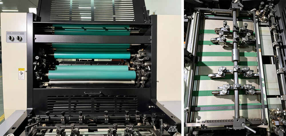 Одноколірна офсетна друкарська машина формату A3 із одноколірною листовою подачею виділяється своїми першокласними функціями, які роблять її надійною та ефективною. Він має міцну механічну конструкцію — чавунну цілісну основу, бічні пластини та ролики — тому він міцний, жорсткий, зносостійкий і поглинає удари. Це означає, що він працює плавно навіть на високій швидкості, щоразу зберігаючи стабільний тиск друку. Хромовані друкарські циліндри дуже добре протистоять зношенню, допомагаючи машині служити довше та скорочуючи витрати на щоденне обслуговування. Високоточні підшипники та заземлені гвинтові шестерні роблять передачу потужності стабільною та плавною, без тремтіння чи збоїв. Безпека також є пріоритетом — захисні пристрої вбудовані в пластини для кріплення, очищення, захисні кришки та регулювання дверцят, щоб забезпечити безпеку операторів і машини. Пневматичне керування зчепленням і чорнильними роликами робить роботу більш надійною, без несподіваних проблем. Механізм кріплення пластини має швидке позиціонування та натяг, що економить час на налаштування. Його частини транспортування паперу — головка подачі, столик для паперу, передня напрямна та захвати — обробляють усі типи паперу, від товстого до тонкого. Пристрій подачі паперу з поворотною рукояткою забезпечує гладкість під час високошвидкісних пробігів, а циліндри пластин і ковдр із опорними кільцями забезпечують високоякісний друк на швидкості. Подвійні пружинні захвати щільно утримують папір, не ковзаючи навіть під час тривалого друку. Крім того, напівавтоматична система очищення чорнильного валика проста у використанні — вона скорочує час очищення, пришвидшує зміну кольору чорнила, полегшує робоче навантаження та підвищує ефективність виробництва. Він також оснащений ПЛК керуванням і сенсорним екраном із простим, легким у використанні інтерфейсом для операторів.